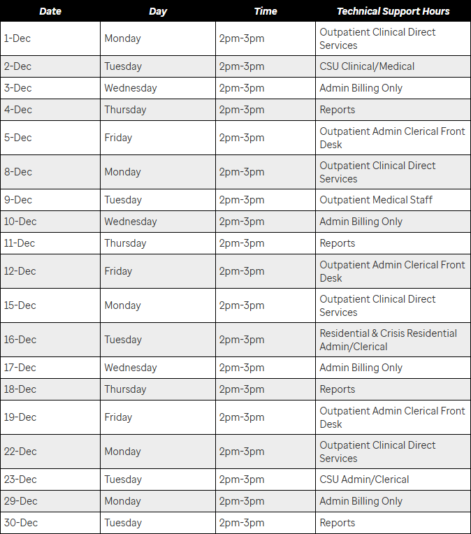 | 16-Dec | Tuesday | 2pm-3pm | Residential & Crisis Residential Admin/Clerical |