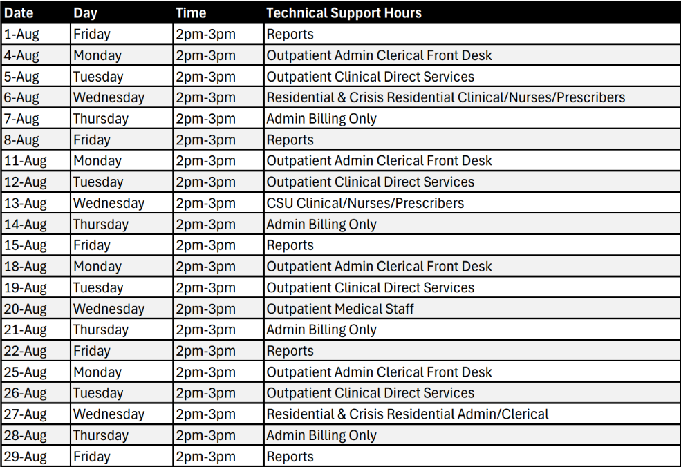 Optum is hosting Technical Support Hours for SmartCare users who need help in completing a function in SmartCare. The types and schedules of the Technical Support Hours are as follows: